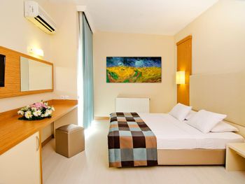 Отличный отель! Вид из окна просто волшебный. Большой семейный номер на 4 человек с балконом. Уборка номера каждый день и смена полотенец также. Очень вежливый персонал в отеле, как на ресепшн так и в ресторане. Вкусная еда. Немного однообразное меню, но все свежее и вкусное. Отель распложен на холме, откуда открывается вид на город и море. До центра пешком минут 15. Но рядом есть остановка автобуса и можно за 6 лир доехать до центра. Бассейн без подогрева, поэтому в апреле для купания вода была прохладной. Красивая и ухоженная территория. Есть настольный теннис. На территории отеля есть небольшой магазинчик, где можно купить какие то вещи первой необходимости, воду, мороженное и все для купания. Также есть сауна и хамам.
