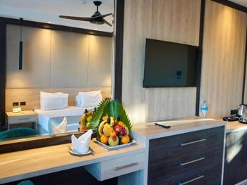 понравилось, что есть место для детей, достаточно большой бассейн, аквапарк. Порадовал сюрприз: тарелка фруктов, фанта и печенье. Даже сердечко скрутили и цветов на кровать набросали. Очень мило. При срочном выселении друга отменили бронь и вернули часть денег, из-за ночного вылета подготовили ланч бокс. Отношение отличное. Номер на двоих был большим. Матрасы удоБные, кровать огромная. Чистое белое белье, хорошие белые полотенца. Пляжные полотенца тоже хорошие. Лежаки у бассейна целые. Водичка в бассейне бодрая.