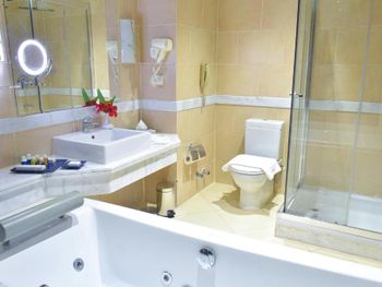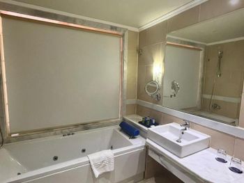 хороший просторный номер, вид с окна, большая чистая кровать, номер с джакузи просто сказка, хороший персонал, халат и полотенца, тапочки принесли сразу по запросу