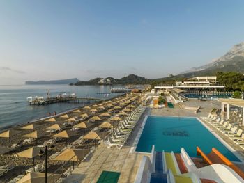 Собственный песчано-галечный пляж находится рядом с отелем. Протяженность пляжа составляет 150 м. Шезлонги, зонтики, пляжные полотенца - бесплатно. Заход в море - песок, галька, пирс.