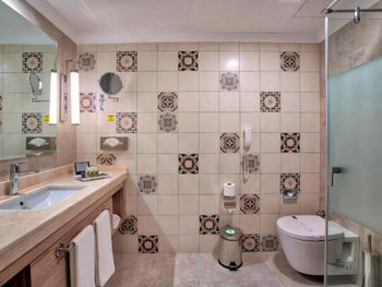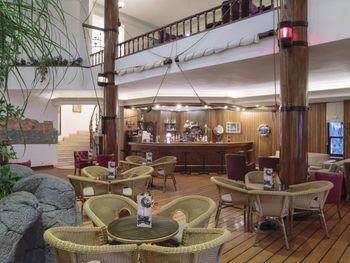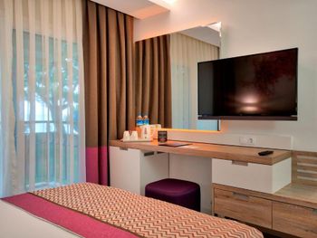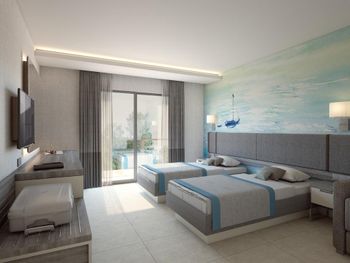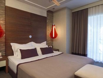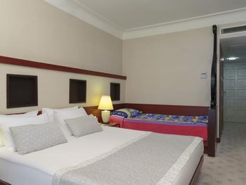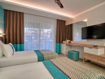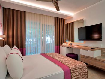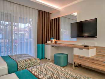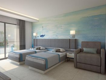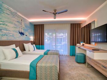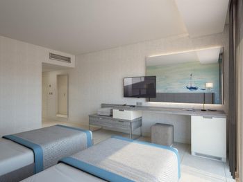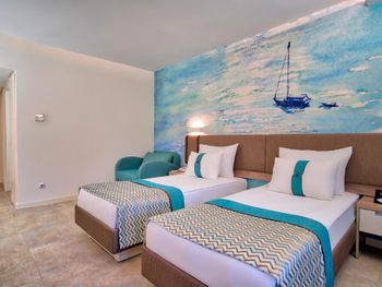 Интернета не было вообще, это большая проблема когда оставляешь ребенка в детском клубе, пришлось подключать роуминг за 400 рублей в день. К мини бару большой вопрос, были только 2 бутылки воды и сок пакетированный. Номера очень маленькие, дверь в туалет стеклянная и не закрывается, а просто как шторка, все слышно. Ну конечно шумоизоляция плохая, слышали всех, кто проходил мимо и кто поднимался. С номером нам еще повезло, нам дали прекрасный вид на гору, а у кто-го то вид-балкон в балкон. На балконе не посидеть т.к все рядом, даже если вы будете разговаривать шепотом, вас услышат, очень тесно. Курят везде, пахнет ужасно и это очень раздражает. Один бар на весь отель, вечная очередь около него. С пляжа приходится топать черед весь отель и еще постоять в очереди под солнцем. Персонал: в ресторане просто сбивают с ног, приходилось постоянно уворачиваться чтоб не толкнули. аниматоры девочки все приятные но был один аниматор (молодой человек) постоянно не трезвый, было не приятно смотреть. Очень противный глос у девушки которая объявляла распорядок дня. Девочки-Аниматоры в детском клубе за 5 дней ни разу не поздоровались и не улыбнулись,было впечатление что нам там не рады. Я бы туда не заходила, но ребенок хотел играть. Пару раз сын рассказывал, что просил позвонить маме но они говорили просто ждать! Детей Очень много, я на мини диско насчитала 45 чел. из 5 дней вечерняя программа 2 раза была действительно интересной, для детей только мини диско. На ужине не хватает освещения ужинаешь на ощупь. Еще один не приятный момент: с 16:00 до 18:30 вы ни где не найдете еду, если только печеньки пожевать у бара. Орешки к пиву ПЛАТНЫЕ!!!(5 евро). Еда на 3+ из морепродуктов только рыба и то не всегда вкусная. P.S Если ночью вы проснетесь от громкого стука на крыше, который не даст вам спать всю ночь, знайте, это сломался водонагреватель, как они сказали: происходит это частенько! потом в вашем номере пол дня проведут ремонтники.