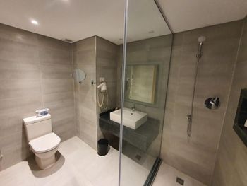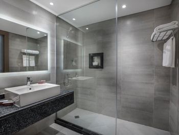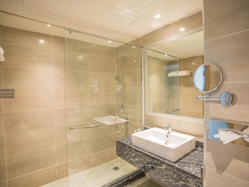 Стильные ванные комнаты с душем или ванной укомплектованы люксовыми туалетно-косметическими принадлежностями и феном.