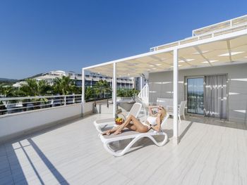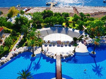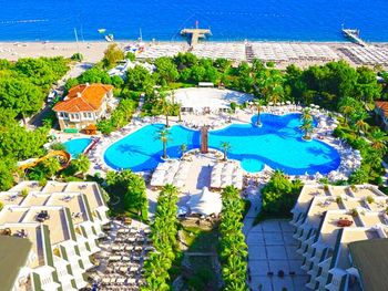Специально брал номера с видом на море, т.к. на три недели и хотелось насладиться видом тоже. Формально балконы выходили в сторону моря, но оно наполовину было закрыто крылом здания, а другая половина терялась за пальмами. За три недели ни дети, ни взрослые не проявили интереса к такому "виду на море". Явно переплаченная зря опция. Отношение к россиянам явно испорченное, в приоритете из других русскоговорящих стран СНГ и Прибалтики, особенно много из Украины (видимо, связано что то на государственном уровне). Конфликтов на этой почве ни каких не было у нас, но впервые столкнулся в Турции с нежелательностью видеть в отеле россиян. Открытого неприятия нет, но какое то ощущение, что не совсем желанные гости. Цены на все явно завышены (может из-за закрытия сезона: были с 3 по 23 августа включительно).