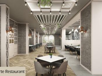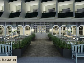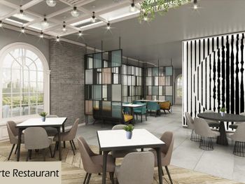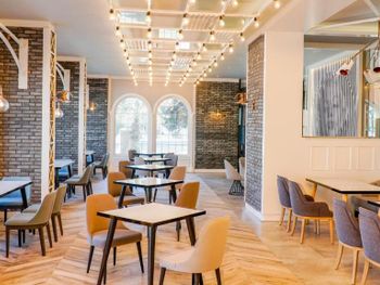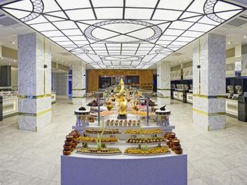 У отеля красивая территория, много зелени и мест для отдыха. Красиво оформлен зал для еды, есть своя кондитерская.