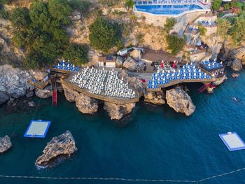 Пляжа нет, отель на скалах, спуск в воду по лестнице, деревянные помосты с лежаками. На завтраке народу куча, помещение большое, блюд много, но много повторяющихся, создающих впечатление, что есть большой выбор и разнообразие.