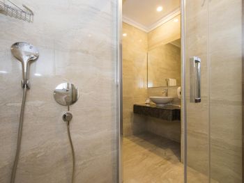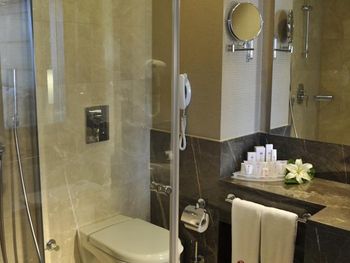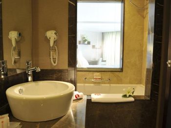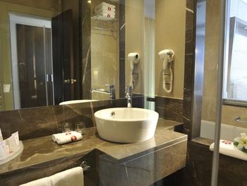 В номере не очень-то чисто. Наполовину убитая сантехника, в одном умывальнике просто не было горячей воды, душ не держится, вода из лейки течет во все стороны. Нет никаких крючков для полотенец, их просто некуда повесить. Непонятная схема уборки в номере: мусор не выносят, могут в одной ванной положить кусочек мыла, в другой - нет. Пол не моют, не пылесосят - потому достаточно грязно.