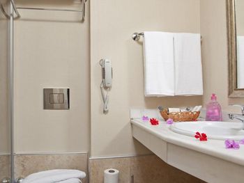 Нет интернета на территории отеля! Во всяком случае для телефонов Samsung и HTC, Только в лобби и у бассейна рядом с лобби. Причем они знают о проблеме и ничего не делают, только плечами пожимают. Убирают тоже не очень хорошо. Полотенца не меняли, а просто выносили на балкон и вешали на стулья на балконе. Приходилось просить поменять. Фен был, но высушить волосы полностью не удавалось ни разу, мигом перегревался и отключался, и это на короткие волосы! Ну и номер на фото был совсем другой, просторный, а предоставили меньше.