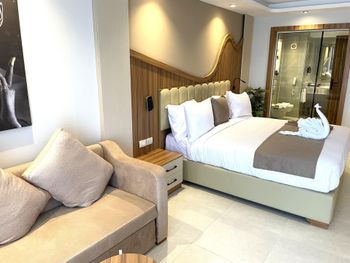 Номер: 65 кв.м., двухкомнатный номер, межкомнатная раздвижная дверь, спальня с двуспальной кроватью (размером 180 см х 200 см) и спальня с двумя односпальными кроватями (размером 120 см х 200 см), ванная комната, балкон или терраса.