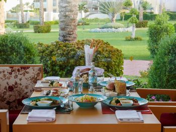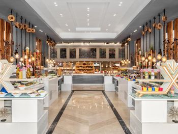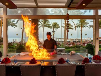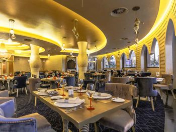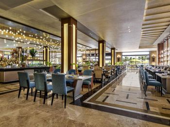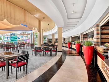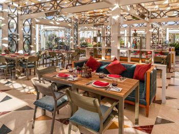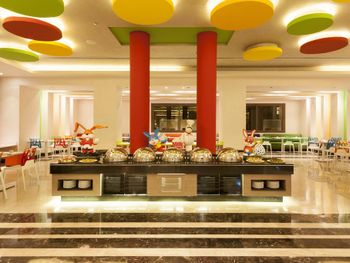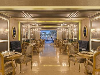Отель слишком большой,если вы живёте в корпусах у аквапарка, то до ресторанов придётся ездить на элекетрокарах, пешком далеко.Зона купания очень далеко от береговой линии, длина пантона почти километр, а у берега глубина во время прилива всего сантиметров десять. Сервис ужасен, персонал не обучен. Основной ресторан - это огромный шумный буфет-столовая. Выбор блюд очень большой, но вкусной еды не попадалось. (кроме сладостей, они хороши). У основной массы блюд отсутствует надпись, догадайся сам что это или спроси у персонала. Там где надписи блюд есть перевод может поставить в тупик. Например у фаршированной жаренной птицы была надпись на русском " чучело голубя". В рестораны Аля-карт предлагается записаться через приложение, но нам ни разу это не удалось. Спасибо менеджеру Оксане, помогла зарезервировать столики на всё время проживания. Из всех достоин положительного упоминания только бразильский ресторан. В остальных готовят не вкусно и выбор крайне скуден. Отдельно про вино. Не ждите, что белое вино вам принесут в бокалах для белого вина и холодное. Вино будет комнатной температуры, т. е. тёплое. Мы решили побаловать себя хорошим вином за экстра мани. Выбор борлее чем скромен во всех ресторанах, около 6-8 видов вина. Начальная цена 150-200 доллараов. Заказали калифорнийское Шардоне. Принесли бутылку как и было указано в меню. Я обратил внимание на слишком тёмный цвет, но при отсутствии опыта выпивания шардоне стоимостью 20000 рублей за бутылку списал это на свою неопытность. Вкус у вина тоже оказался специфическим, как будто разбавлен мадерой. Дрянь. Воспользовался интернетом, чтобы сопоставить свои впечатления с рейтингом в Vivino и с увидел, что цена такого вина в Питере 450 рублей, а рейтинг крайне низок. Тогда я обратил внимание и на дату изготовления вина, 2011год. Понятно, что эти помои мы оставили на столе, но заплатить пришлось.