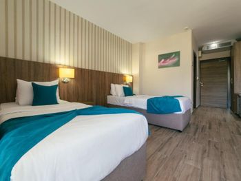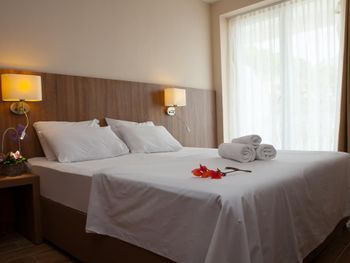 1) Вместо 2 кроватей была 1 кровать и 1 диван. 2) Пол в номерах не моют. С собой из дома брали одноразовые белые тапочки, так вот подошва сказала сама за себя. 3) В номере нет чайника, но может в 4* его и не должно быть. 4) На балконе сушишь одежду на стульях. 5) На пляже гости с вечера оставляют полотенца на лежаках особенно на тех, которое ближе к морю (жёлтые лежаки лучше т.к. у них не падает спинка), и с утра первая линия уже вся в полотенцах, если захочешь их всё же занять, т.к. считаю это неправильным бросать свои полотенца на весь день, то подходит сотрудник, который работает на пляже и говорит "Извините, но это место забронировано".