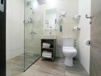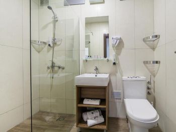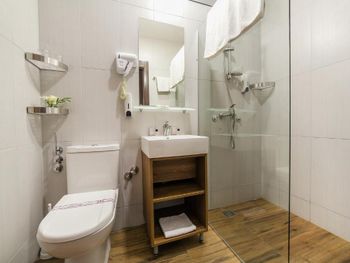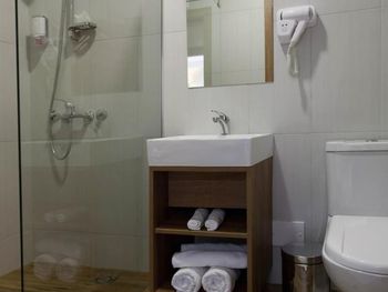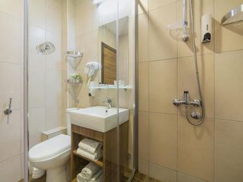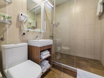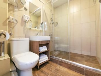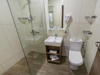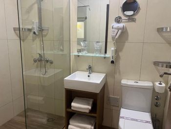 В номере разноуровневый пол, можно упасть, выходя из ванной. Нет халатов и тапочек. Чайник не дают совсем. Ремонт бедненький совсем. В общем, для четырёх звёзд совсем слабовато...