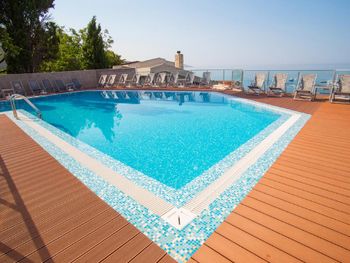 Собственный пляж с удобными лежаками,удобный вход в море(мелкая галька),пляж всегда чистый.На втором этаже СПА зона с турецким хамамом,финской сауной,бассейн с теплой водой,много лежаков,полотенца.