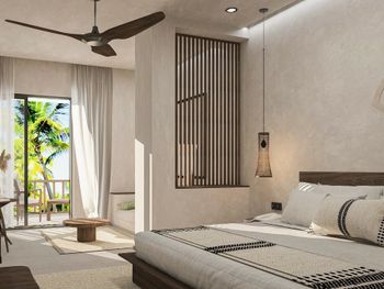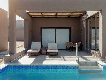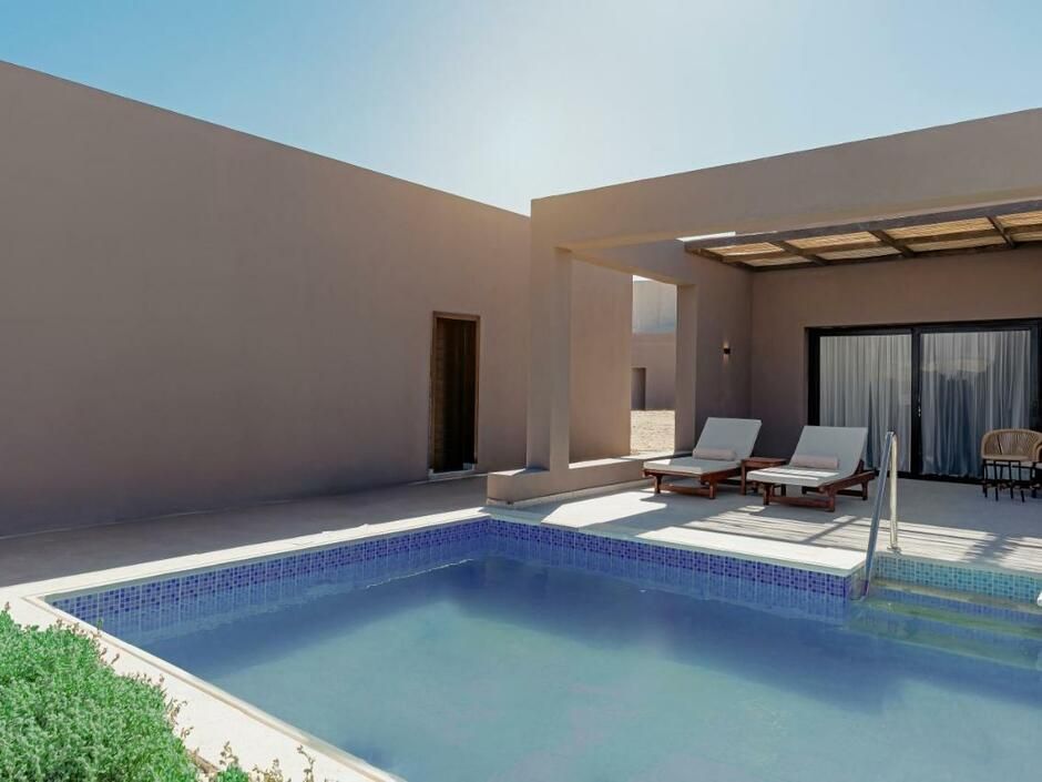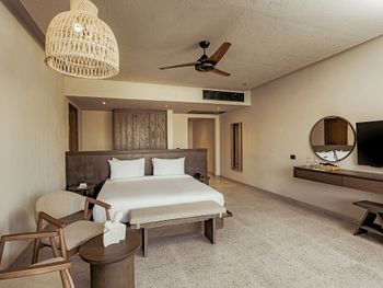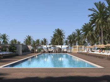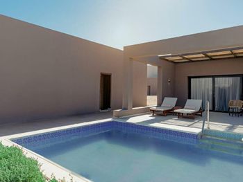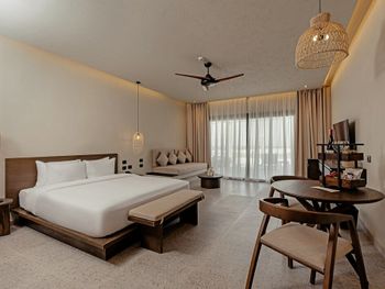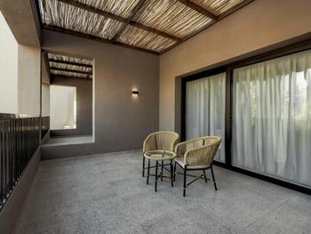 Номер: 54 кв.м., однокомнатый номер с двуспальной кроватью (размером 180 см х 200 см) или двумя односпальными кроватями (размером 120 см х 200 см), зона отдыха с софой, ванная комната с душем, терраса с выходом к общему бассейну, вид на море и пляж.