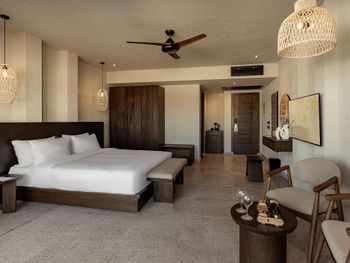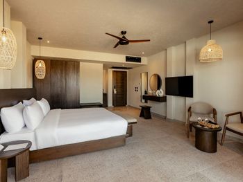 Номер: 76 кв.м., двухкомнатый номер, разделенный дверью, спальня с двуспальной кроватью (размером 180 см х 200 см), гостиная с софой, ванная комната с душем, терраса с выходом к общему бассейну, вид на море и пляж.