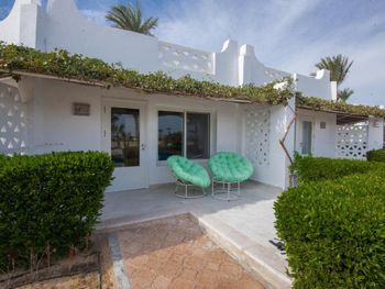 Бунгало находятся на территории огромного пакетного русского отеля. Круто, что мини-домики (сами бунгало) находятся в отдалении от главного корпуса и выглядят так, как будто совсем другой отель. Сами домики супер комфортные. Я влюбилась в этот душ: он с ярким дневным светом от окон напротив огромного зеркала. Дизайн бунгало - очень современный без арабского шика, что круто и сильно резонирует с основным корпусом. В этих бунгало кажется живут только европейцы. По крайней мере, когда мы там жили, кроме немцев и британцев никого не было. Для тех, кто живет в бунгало функционирует свой отдельный небольшой ресторан на пляже для завтраков и ужинов. Это самый вкусный отельный ресторан на территории всего Египта (а я жила в 11 разных отелях). Короче, здесь правда кайф!