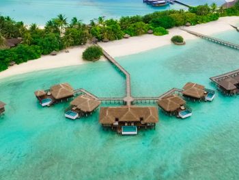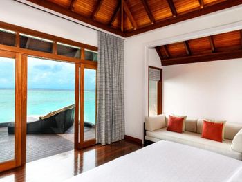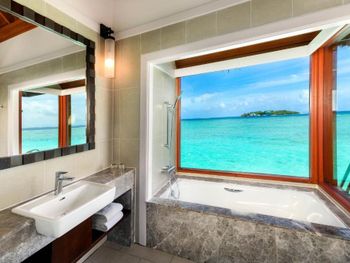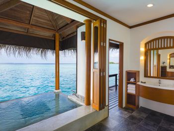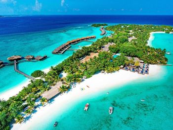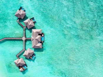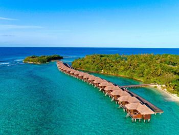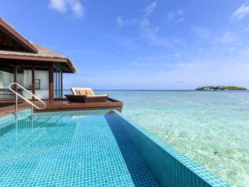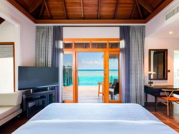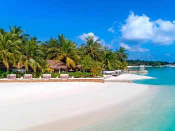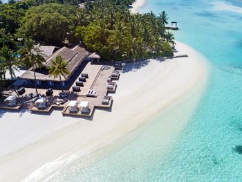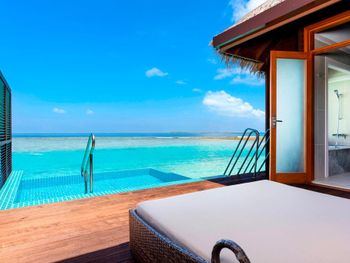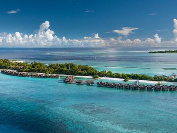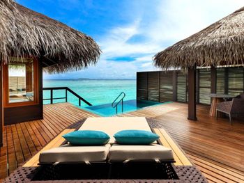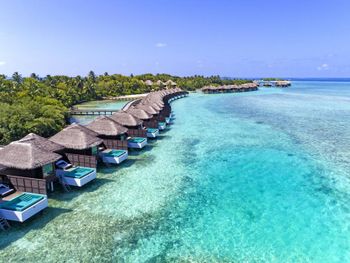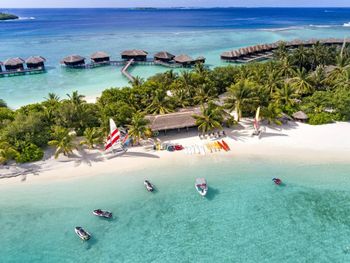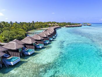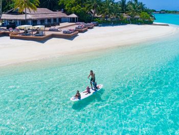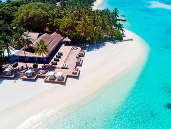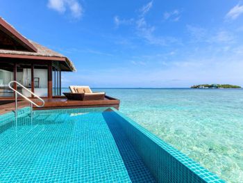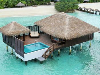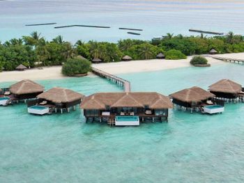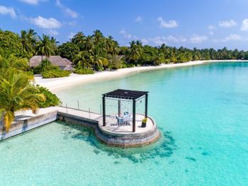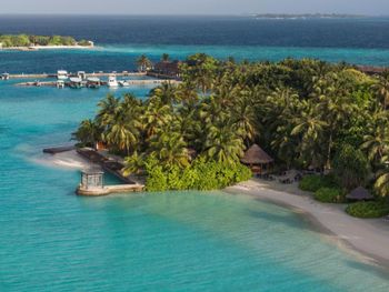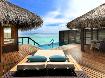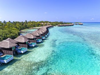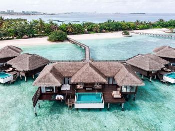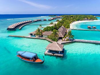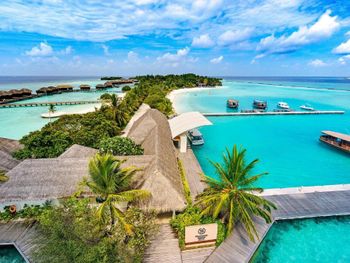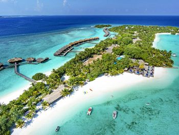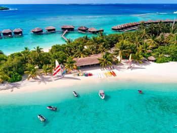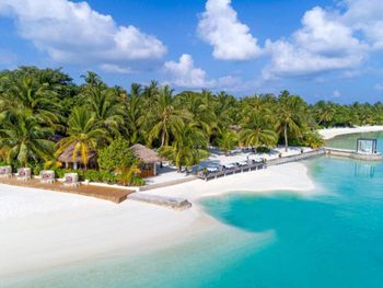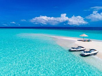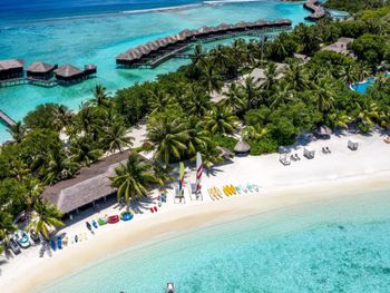 White sands, crystal waters and gold sunshine feature at the luxurious Sheraton Maldives Full Moon Resort & Spa & Spa & Spa on the private Furanafushi Island in North Male Atoll, Maldives. The resort is accessible by a 15-minute speedboat ride from Velana International Airport.