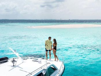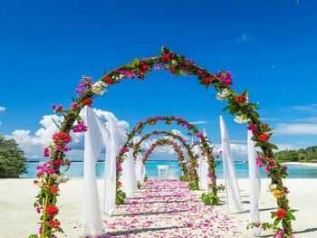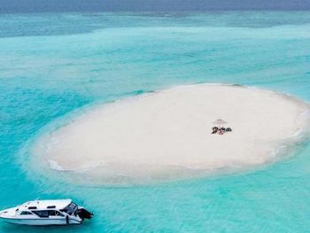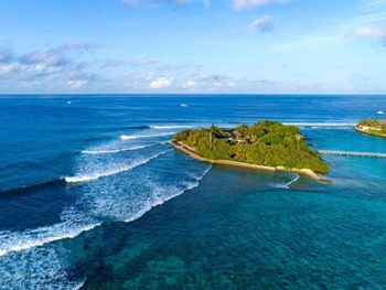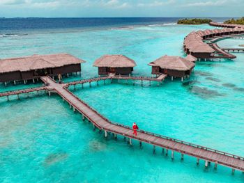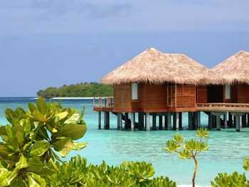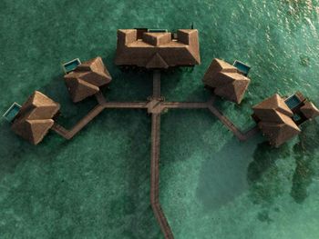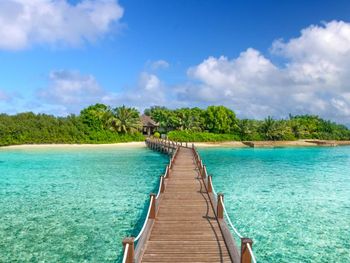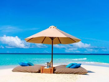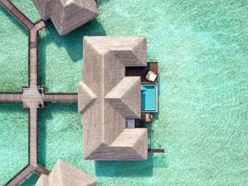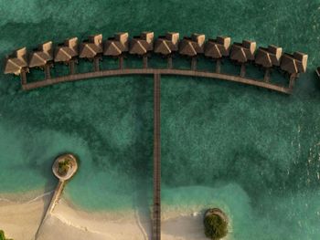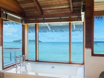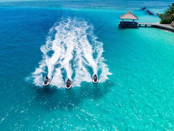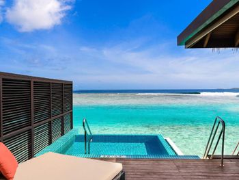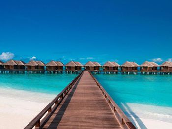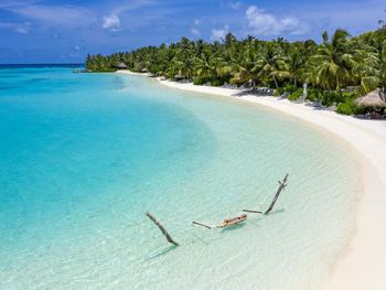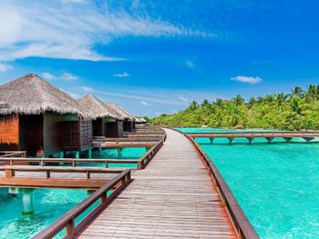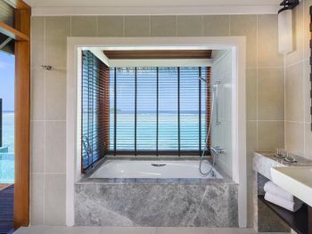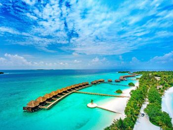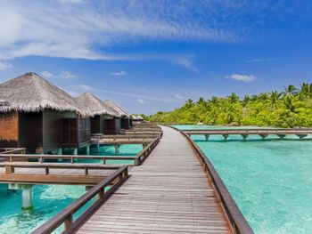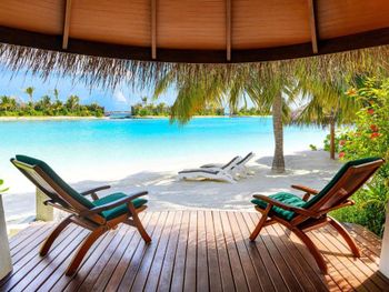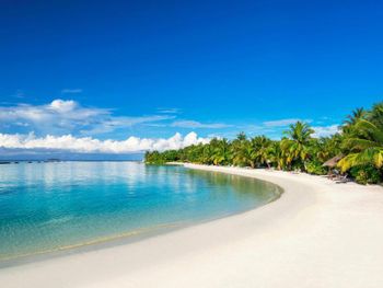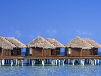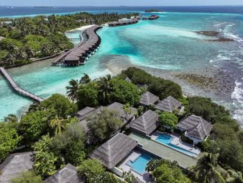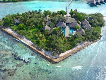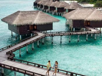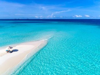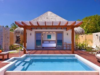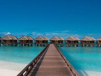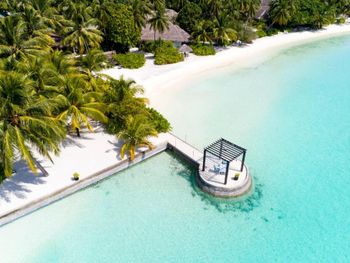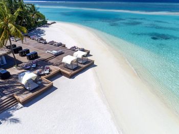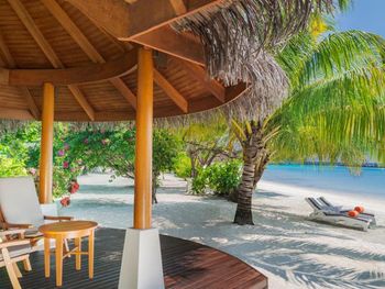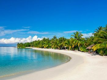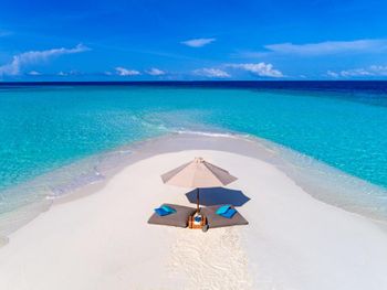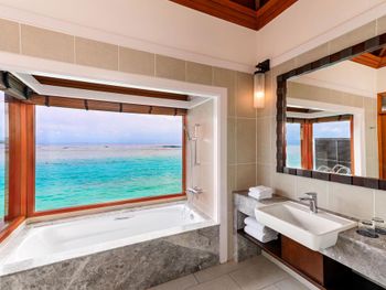 White sands, crystal waters and gold sunshine feature at the luxurious Sheraton Maldives Full Moon Resort & Spa & Spa & Spa on the private Furanafushi Island in North Male Atoll, Maldives. The resort is accessible by a 15-minute speedboat ride from Velana International Airport.