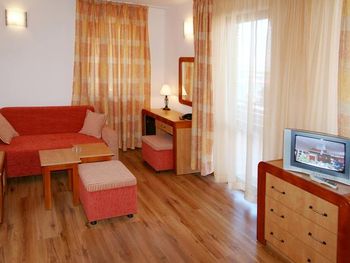 В номере чисто, довольно тихо и прохладно, центральный кондиционер, есть маленькая кухня со всем необходимым. Недалеко небольшой приятный пляж. В кафе делают завтрак за 3 евро для гостей отеля (яичница из одного яйца, сыр, колбаса, джем, помидор, огурец, масло, крохотный кофе).