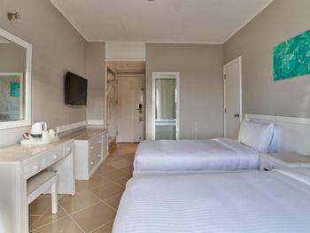 Мы отдыхали в этом отеле 2 дня. К сожалению, по факту это 3 звезды : медленный сервис ( начиная от заселения, устранения неполадок в номере и заканчивая состоянием самого номера : все старое, сантехника некачественная, в душе вода плещет во все стороны, заливая весь пол, вытяжки в ванной комнате нет никакой- образуется духота. Постельное белье старое и некачественное, кровати никак не закреплены к полу и «путешествуют» по комнате. Сам номер просторным не выглядит ( где 45 метров мы не заметили). Кондиционер работает нестабильно + выделяет зловонный запах.