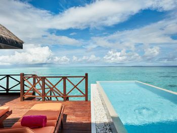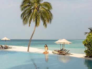 Мы жили в двух виллах на воде и на пляже. Виллы просторные и красивые, есть все необходимое: полотенца для пляжа, полотенца для бассейна непосредственно у него, зонтики, тапочки, все наборы, несколько подушек, все очень чисто убираю дважды в день. Еда вкусная, особенно итальянский уголок и кокосовое мороженое. У нас был полный пансион, напитки докупали отдельно, на территории отеля нет наличных, только чеки, что тоже удобно. Очень вежливый и приветливый персонал, оперативно решают любой вопрос, особенно наша хостес Шам. Приветливо нас встретила, все показала, проводила до виллы, с чемоданами помогли на всем пути. Доставили нас на гидросамолета, даже без ожидания, по высадке отель был первым. В мае читали про сезон дождей, но дождь за время пребывания был один раз, остальное время иногда ветрено, но комфортно и чаще всего жарко. В вилле на пляже удобный подход к океану и вид на океан, в самих виллах прохладно и комфортно, есть летний душ, ванна и обычный душ. Наша вилла со стороны рифа, риф красивый, если хотите искупаться, то помимо рифа есть пляж с комфортным спуском и красивым видом.