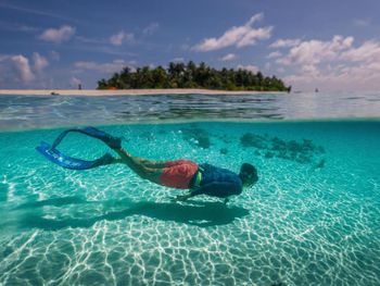 Домашний риф, много рыбок, но к сожалению кораллов живых ооочень мало. Нет комаров. Шоу ежедневное с кормлением скатов и акул потрясающее. Вкусное мороженое. Транспортировка с Мале до острова на гидросамолете организована отлично, и с туристами и багажом, не было проблем.