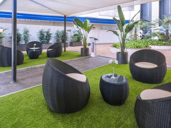 Мы приехали с маленьким ребёнком. Номер понравился. По наступил вечер. Шум от дискотеки отеля напротив, через железную дорогу был просто катастрофическим. Звук усиливался за счёт отражения звуковых волн от стен. Ребёнок долго не мог заснуть.Плюс шум от электрички. За 13 дней мы выучили весь репертуар чужого отеля не выходя из номера. И нет режима тишины после 23.00.