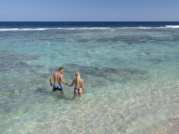 Море до рифа то же мелкое 30-40 см глубина до рифа, но зато риф живой риф за понтоном прекрасен , но понтон 70% времени закрыт из-за волн или если нет волн, то якобы акул , а по факту их ломает выделать спасателей.