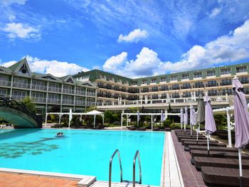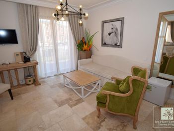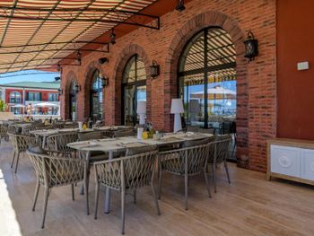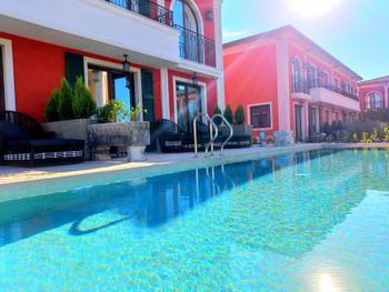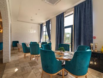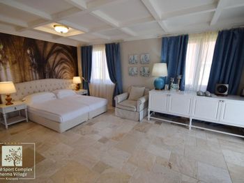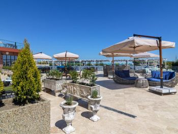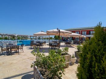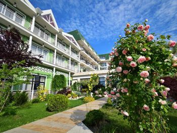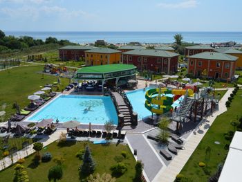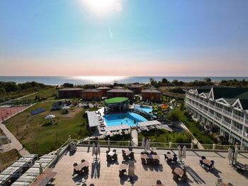 Прекрасный бассейн с минеральной водой, хлоркой не пахнет, летом в нем мало народу. Можно прыгать с бортика и стоек. Под стойками глубина 2 метра. Очень удобно. Можно плавать в любую погоду. Хорошая сауна. Красивая территория. Отличный тренажёрный зал. Очень удобный семейный двухэтажный номер. Уборка по требованию, смена белья-1-2 раза в неделю. В all inclusive входит 3 разовое питание, напитки в течение всего дня, чайная пауза с 16 до 17(печеньки, мороженое, которое можно положить себе ложкой, фрукты, картошка фри, бутерброды). Большой пляж, рядом есть конюшня с возможностью прогулок по берегу моря. И для умеющих ездить, и для совсем новичков. Можно погулять в поводу. Недалеко магазинчики, можно купить все, что необходимо.
