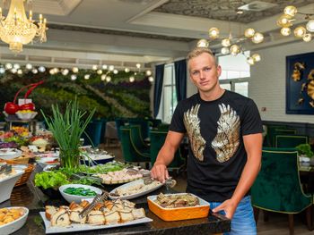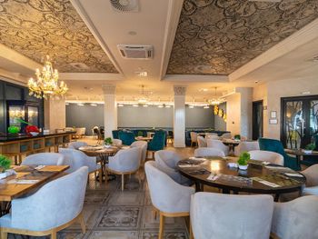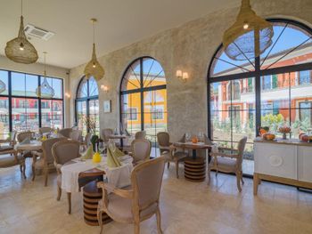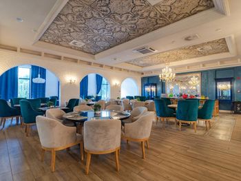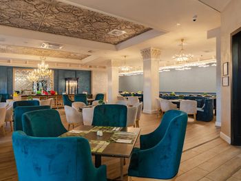 Сервис совковский. Обслуживающего персонала явно не хватает. Стараются, но просто не успевают. Поэтому качественно убираются только перед заездом новых гостей. Балконы не моют вообще. Одеяла в пододеяльники не заправляют. Про ресторан разговор отдельный. Количество блюд небольшое, часто, не особенно вкусно. Детей не всегда можно покормить. Еда не подписана. Приходится гадать, что там за мясо. Звала поваров, временами, сами не знают из чего сделано. Тарелки старые, отбитые. И просто, откровенно грязные!! К середине завтрака, обеда, ужина не хватает ничего. Купили одноразовую посуду, пользовались ей. Посуды нет, еду подносят медленно, за всем надо охотиться. За блинами (кстати, невкусными) дети стояли утром в очереди по полчаса. Без преувеличения. Завтрак с 7.30. До 8 блины не пекут, потом пекут очень медленно. Во всех отелях к началу завтрака, все судки с едой полные. В том числе, с блинами, оладьями. За горячими напитками очередь. Обычно ставят бойлер отдельно. Тут только автоматы. Чтобы разбавить холодный напиток для ребёнка, надо отстоять в очереди людей, стоящих за кофе. Многие номера прокурены насквозь. Очень много курящих. Это же семейный отель!! Можно организовать зоны для курящих. И места для курения подальше от балконом семейных номеров. А то основное место напротив двери в крытый бассейн, входа в отель и балконов детских номеров. Дым попадает везде. И в бассейн, и в коридор, и в комнаты через открытые двери. И зачем в детских номерах пепельницы?!! Сделайте номера для некурящих, как везде. Полотенца выдают всего 2 часа в день. И менять нельзя в течение дня !! В тренажёрный зал ходят все в чем хотят. В пляжных тапках, босиком. Под беговой дорожкой песок. Хаммам очень горячий. Не сесть, ни лечь. На 5 звезды отель не тянет никак. 3-максимум.