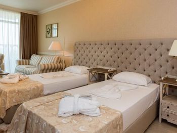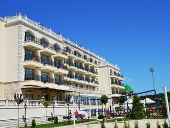 Отель не тянет на 5 звезд и близко. Все включено - это не значит что все включено! All Inclusive - это только еда в ресторане и местные спиртные напитки, за любые другие услуги нужно платить. Даже кофе и чай в номере оказались платными. Даже мороженое для ребенка оказалось платным, хотя в других болгарских отелях 4 звезды мороженое и закуски были бесплатными. Что бы решить какую либо проблему персонал нужно упрашивать и постоянно напоминать о проблеме. например на сайте было указано что в номере есть есть чайник, но его не оказалось, пришлось объяснять зачем нам нужен чайник, так как давать его не хотели. Тоже чай попить в номере было не из чего, пришлось взять несколько кружек из столовой. С организацией и доп. услугами все очень печально. У жены было день рождения, хотел заказать цветы и праздничный ужин с тортом, понятно что не бесплатно, предлагал деньги. Цветы заказать через них невозможно, оказалось что в этом поселке вообще нет цветочного магазина. Попросил организовать вечерний ужин, тоже не бесплатно. Но получилось крайне печально. Кроме торта, который сделал повар, ему отдельное спасибо. Они даже не смогли пригласить аниматоров для поздравления. В номере вся плитка в ванной была крайне скользкой, а так как душевая кабина протекала каждый раз заходить в ванную было опасно для здоровья. Администрация ничего не смогла предложить по этому поводу, Пришлось кидать полотенца на пол что бы безопасно ходить в ванной. Пожилая женщина администратор из СПА не реагировала на наши вопросы, отказалась сделать экскурсию по СПА и смотрела на нас пренебрежительно, потому что мы отказались от платных услуг которые она нам навязывала игнорируя наши вопросы и желания. Как оказалось на пляже тоже есть 2 зоны - обычная и ВИП. На ВИП пляже за лежак нужно платить. Но мы узнали это только через 10 дней пребывания на пляже в ВИП зоне. Не смотря на то что у нас был All Inclusive, а мы снимали самый дорогой номер в отелеле, нам тоже нужно было платить за лежаки в ВИП зоне.