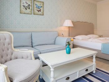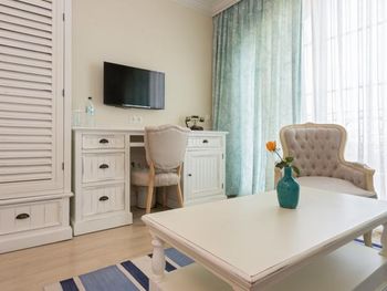 Все номера/апартаменты оформлены в современном стиле и оборудованы телевизором с плоским экраном и спутниковыми каналами. В распоряжении гостей сейф и гостиный уголок с диваном или креслом, а в апартаментах также имеется мини-кухня с обеденной зоной. В ванной комнате с ванной предоставляются фен, тапочки, халат и бесплатные туалетно-косметические принадлежности. С балкона всех номеров/апартаментов открывается вид на море.