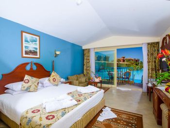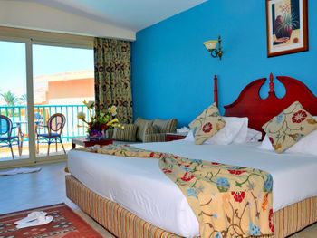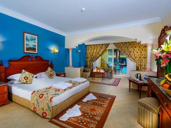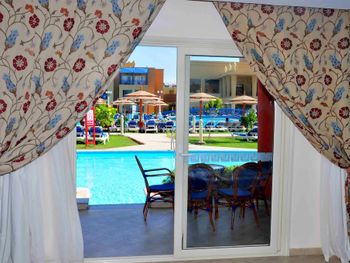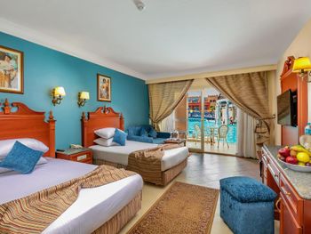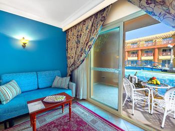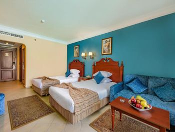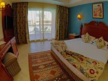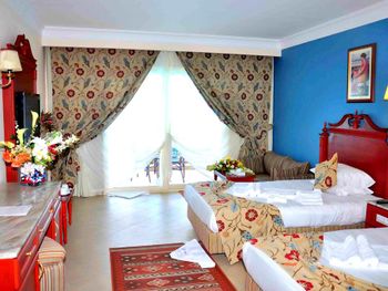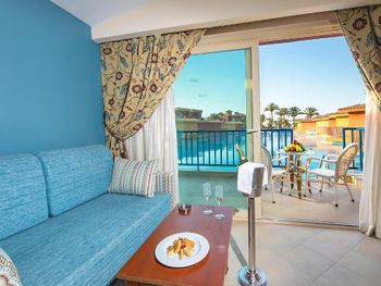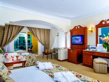Просторный номер на первом этаже с собственным выходом через балкон в бассейн. Большая ухоженная территория, много развлечений: горки, качели, детские площадки, бары, также прямо в отеле есть ночной клуб и игровой центр (бильярд, боулинг и автоматы за отдельную плату). Песчаный заход в море, широкая пляжная линия. Каждый день живая музыка, а также спортивные активности от анимационной команды. Разнообразный шведский стол.