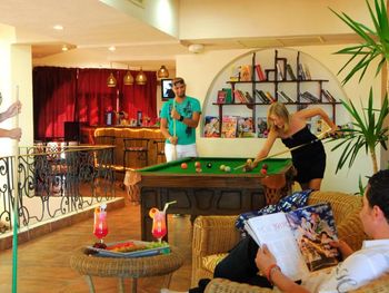 Работа ресепшн на тройку с минусом, сначала заселили в номер с двумя кроватями, хотя заказывали одну большую, потом, видимо, хотели денег за переселение, но не дождались и под конец хотели вызвать нам такси за 100 долларов, вместо 50 до аэропорта. В биллиард можно играть, только одним кием, остальные кривые. Повара на раздаче жуткие напыщенные жмоты, выдавали, как свое.
