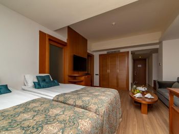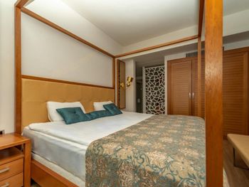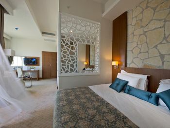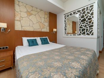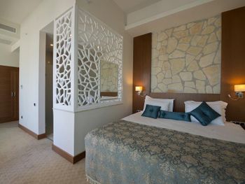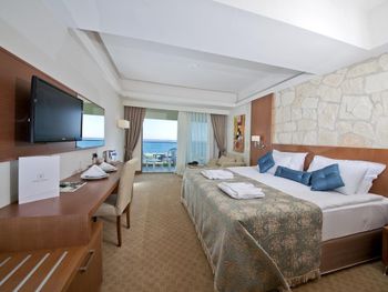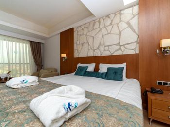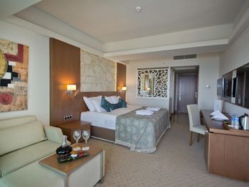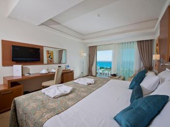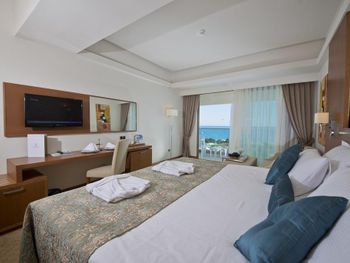 У нас был прекрасный номер с видом на море. Как и бронировали. Иногда был запах гриля по вечерам (так будет во всех номерах с видом на море), но к этому мы относились спокойно. Кондиционер работал хорошо. Если возникали проблемы, общались по телефону (там отвечают и на русс и на англ, выбирайте сами, как говорить с ними) и всё чинили очень быстро! Сейф бесплатный. Халаты, тапочки. Полотенца хорошие, свежие и для душа и для пляжа. Белье постельное чистое. Бассейн чистый, вокруг бассейна тоже чисто. Про алкоголь не знаем, не пьем. Зато вот спорт-зал в целом хороший. Правда душно было даже с кондиционером, не знаю, что за проблемы были, но потренироваться можно. Там днем можно застать девушку, которая поможет и объяснит с тренажерами. Спа-центр хороший, чистый, много сказать не можем, были на 1 процедуре. Сходили в кинотеатр маленький в отеле, фильм правда так себе, но скрасить вечер было приятно. Вода бутилированная везде, вездеее, это огромный плюс и спасибо! Отдельная похвала это наши русские аниматоры. Развлекают круглосуточно! Отель и правда больше рассчитан на взрослых, так то с детьми лучше в другой. Дискотеки все до 12 и в этом отеле и в соседнем, выключают ровно в 12 и можно заснуть. Еда понравилась, все было вкусное, сытное. Мясо, курица и рыба на гриле на улице очень вкусное! Сладкое тоже отличное. Минусы: соки везде разводные кроме завтрака, но это везде так, еду раньше времени начинали убирать и иногда не могли найти чистых приборов, ходили за официантами, чтоб дали. Отельное спасибо гостям за то, что не занимали лежаки с 5 утра! Мы всегда находили места и у моря и у бассейна! Пляж чистый и ухоженный, камни есть мелкие, но терпимо. Зонты над лежаками - большие полотна, можно не передвигать лежак каждые пять минут в погоне за тенью. Недалеко от отеля есть магазины, все сувениры, сладости можно купить там.