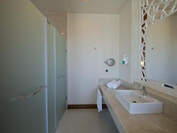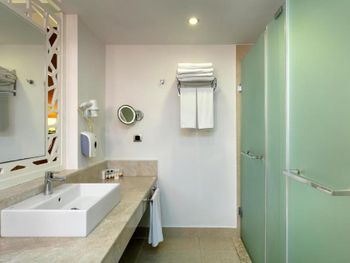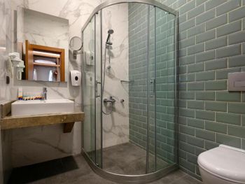В первую очередь не понравился туалет, точнее то, что унитаз находится в углу комнаты и прикрыт стеклянной непрозрачной дверью. Душ выглядит также. Второе что не понравилось, так это то, что после одного стука в дверь, персонал тут же открывает её не дождавшись, когда я отвечу. Это напрягает, потому как не ожидаешь что кто то может войти.