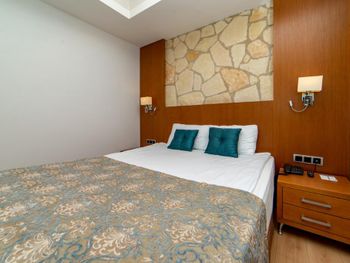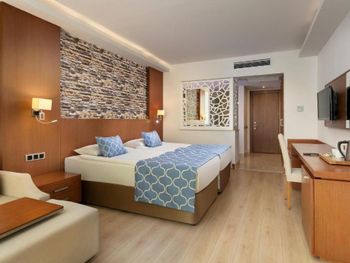 Номер был просторный. Понравилась большая, упругая кровать, которая к тому же ещё и не скрипит. Уборку делают каждый день. Холодильник правда не пополняют. Есть аниматоры, которые развлекают детей. Что касаемо еды, то наверно все как у всех. В меню всегда были рыба и мясо , приготовленные на гриле , запеченные или тушенные. Овощи, фрукты, сладости в ассортименте. Недалеко от гостиницы есть базар. Примерно в километре от гостиницы есть магазин Migros, Carrefour, а также аптека. Wi-Fi работает на всей территории гостиницы. Да ещё что понравилось, у меня было день рождение и сотрудники украсили номер шарами, принесли в номер 2 бутылки вина и торт. Торт был очень вкусный. Спасибо огромное, мне было приятно!