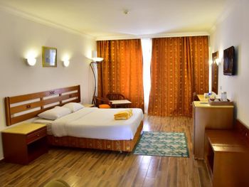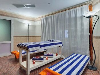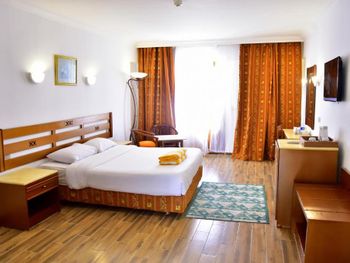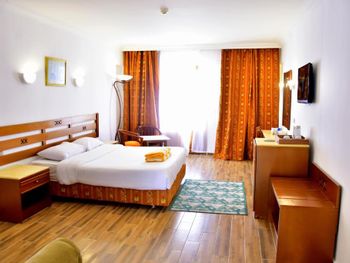 Персонал очень дружелюбный и приветливый. Бассейн отличный, для самых маленьких и тех, кто любит глубину. А водные горки это отдельное удовольствие, особенно для детей. А для взрослых есть бар в бассейне, крепкие напитки, охладительные и перекус можно там найти. Обеды разнообразные , хорошие, можно подобрать для себя и мясо, и рыбу, овощи, и десерты. Так же в номер приносили фруктовую тарелку. Вечером развлекательная программа для детей и взрослых. Мы отдыхали с детьми, им очень понравилось, аж не хотели уезжать. Так же на территории есть игровая площадка для детей. Сам номер у нас был с балконом и видом на бассейн. В номере есть чайник, кофе, чай, сахар, холодильник, кондиционер работал хорошо, телевизор, с небольшим количеством каналов. Конечно, ремонт необходим номерам, сан узел устарел, при заезде чистота в номере была сомнительная ( пыль на быльцах кровати, белье с пятнами, полы в ванной и сан. Узел были грязные и т.п.) .
