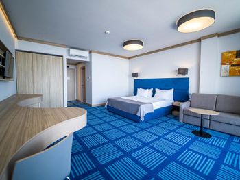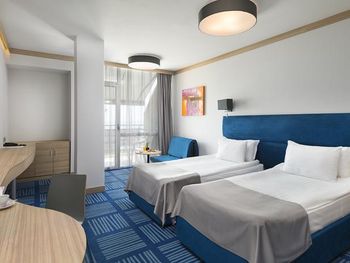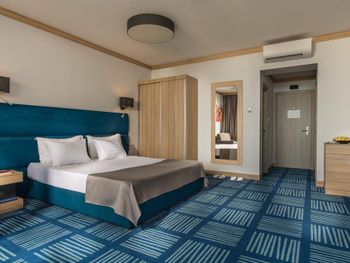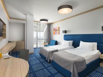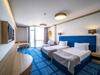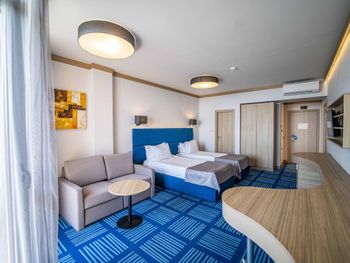 отель относительно новый, семейные номера просторные и удобные, стандарты несколько маловаты, особенно ванные комнаты, очень хорошая уборка. Меню не особо разнообразное, но то, что пробовали было вкусное.,очень насыщенная анимационная программа, в номере балкон с мебелью и сушилкой, кофемашина, безлимит питьевой воды.
