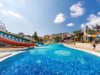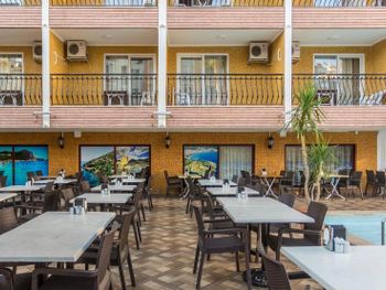 Очень хороший отель, буквально в 5 минутах ходьбы от пляжа Клеопатра. Там же канатка. По пути к пляжу, т.е. совсем рядом супермаркет Мигрос. С ним же рядом аквапарк. Т.е локация отличная! Отель имеет свою пляжную зону и предоставляет бесплатные шезлонги и зонтики. Еда очень разнообразная (были в конце июля) и вкусная.