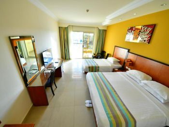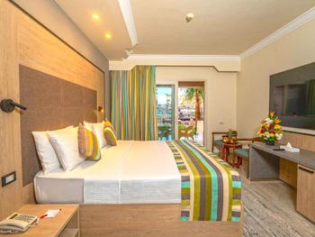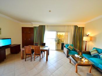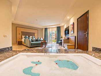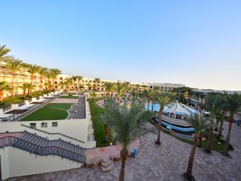 Хорошее питание, хороший риф, аквапарк. Детям отель понравился, потому что каждый день были гамбургеры, фри, шаурма....и был аквапарк. Но отель ужасно грязный, по приезду в коридорах было куча мусора, пластиковые стаканы, мусор, листья. Как после какого-то праздника... Мы были в шоке, на следующий день убрали мусор, но пол так и остался в пятнах от напитков. Под каждым кустом мусор. Первый раз такое вижу. Номер это отдельная тема, по ощущениям что там никто не жил до нас. Окна грязные как после ремонта, комоды не открываются, дверь шкафа отпала при первом открытии, сейф не работал (мастер так и не пришёл), унитаз тоже не работал (муж сам починил). И это был супер люкс. Вода в ванной не стекала. Сантехника грязная. Когда открыли шторы, на полу лежало гнилое яблоко с бумажками. Часть гелей и шампуней были на половину использованы. Так и стояли на ванной, после предыдущих гостей. Жили два дня, уборки не было, соответственно полотенца тоже не меняли. До это жили по два дня в двух отелях ниже уровня (3*и 4*), уборка была каждый день. Хотели на последок получше отель 5*, но были разочарованы. Можно сюда ехать, если уж совсем дёшево и быть готовым помыть свой номер самим для себя. Что мы и сделали. И за поздний выезд в 16:00 доплачивали.